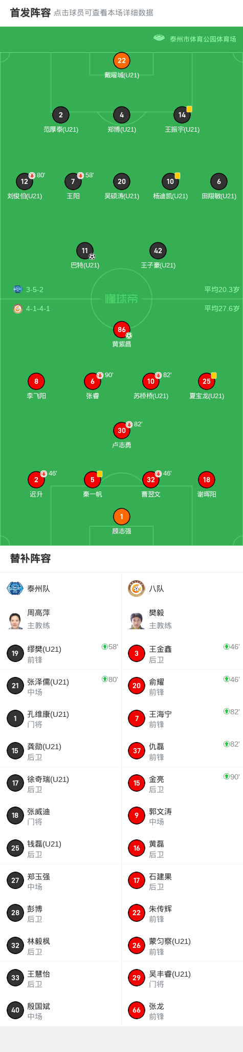 江苏省城市足球联赛第10轮,泰州队主场迎战八队。比赛中,泰州队球员巴特率先打破僵局,为球队取得领先。随后,八队球员黄紫昌通过点球机会扳平比分。最终双方以1-1握手言和。
