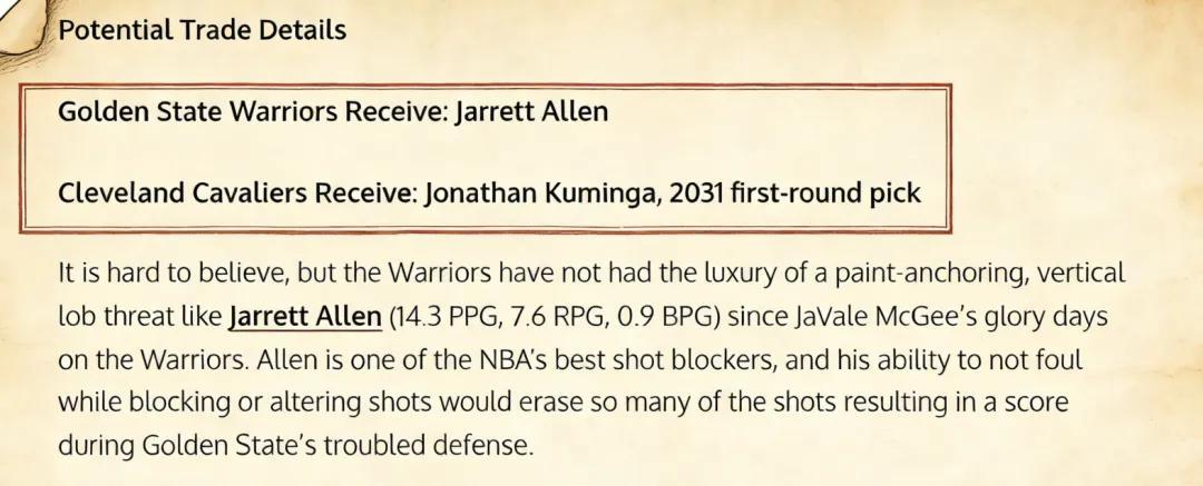 美媒《Fadeaway World》撰文建议,勇士可以将库明加和2031年的首轮签打包送到克利夫兰,换回中锋阿伦。